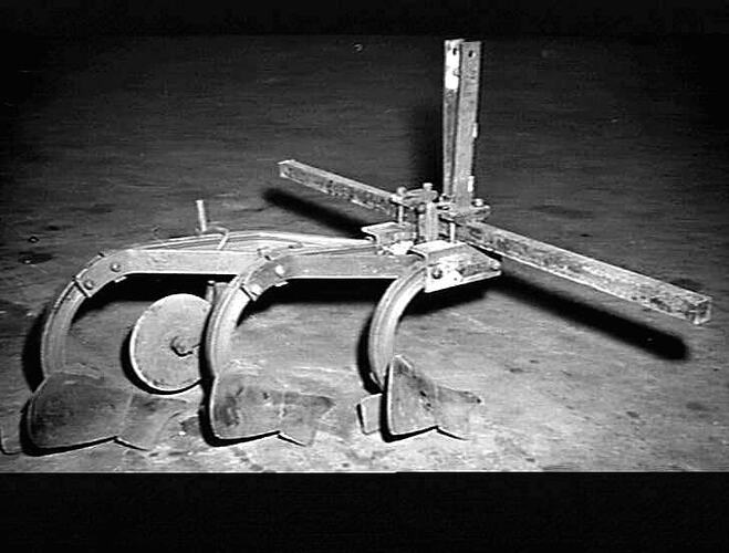 'Light vineyard plough attachment for (above) tool-bar. This can be off-set as desired.' light vineyard mouldboard plough.