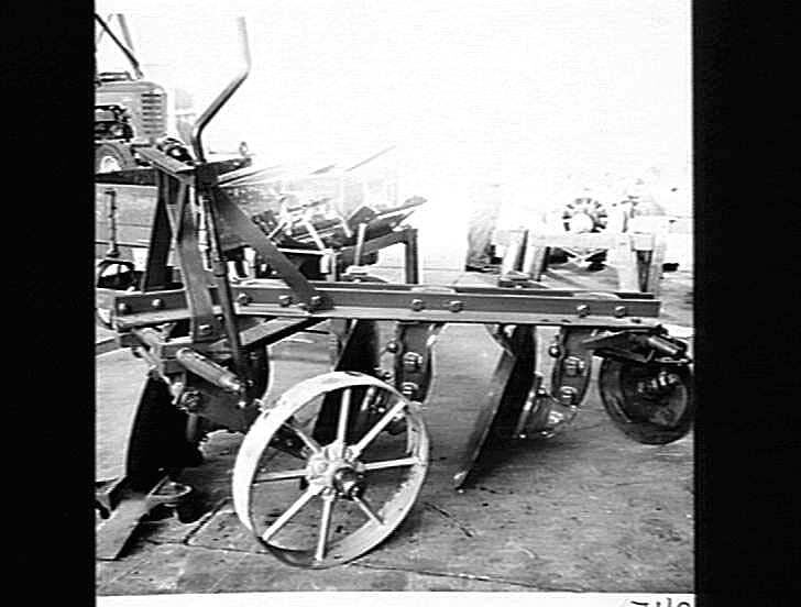 "3-FURROW `SUNNIE' OVERBEAM DISC PLOUGH FOR 3-POINT LINKAGE. WILL CARRY UP TO 28 INCH DISCS. REAR FURROW WHEEL IS SPRUNG TO PREVENT PLOUGH THROWING OUT OF FURROW IN ROUGH GROUND: APR 1954"