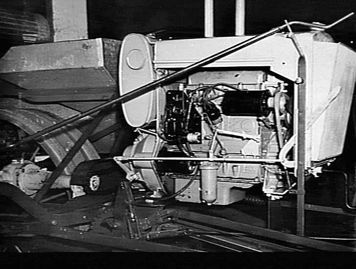 Austin engine fitted to a Sunshine No. 6 Header Harvester, December 1950. Austin engines were brought in and adapted to suit Sunshine baler and header after losing availability of the Hercules engine. Later the company went to Perkins engines.