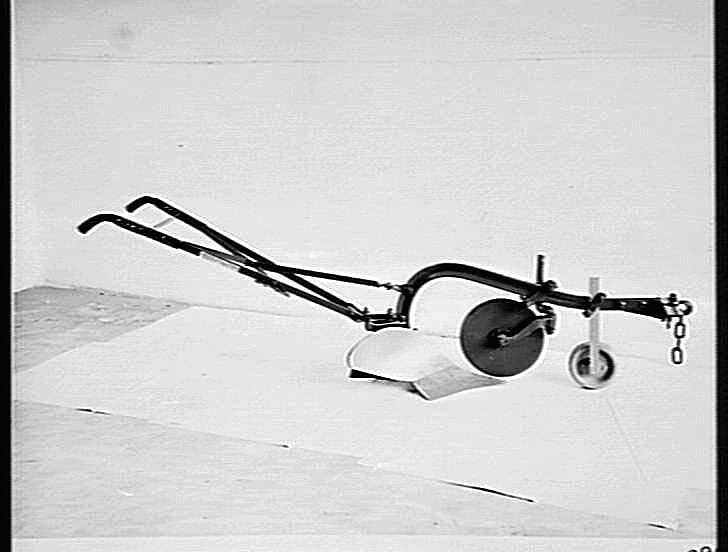 A horse-drawn No.44 mouldboard plough with disc coulter and adjustable share.