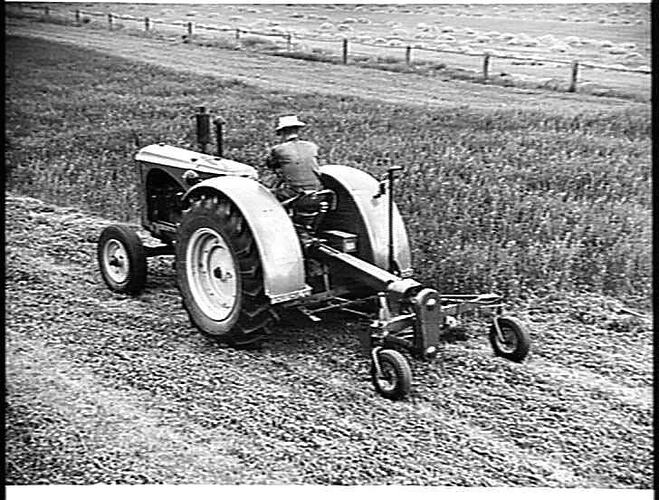 'No.254: on Mr. Robert Green 's property,'Underbank', Bacchus Marsh, Vic. Sunshine power-take-off mower coupled to sunshine Massey Harris tractor cutting a paddock of lucerne estimated to go 2 tons to the acre at the rate of approximately three acres per hour. February, 1948.'.