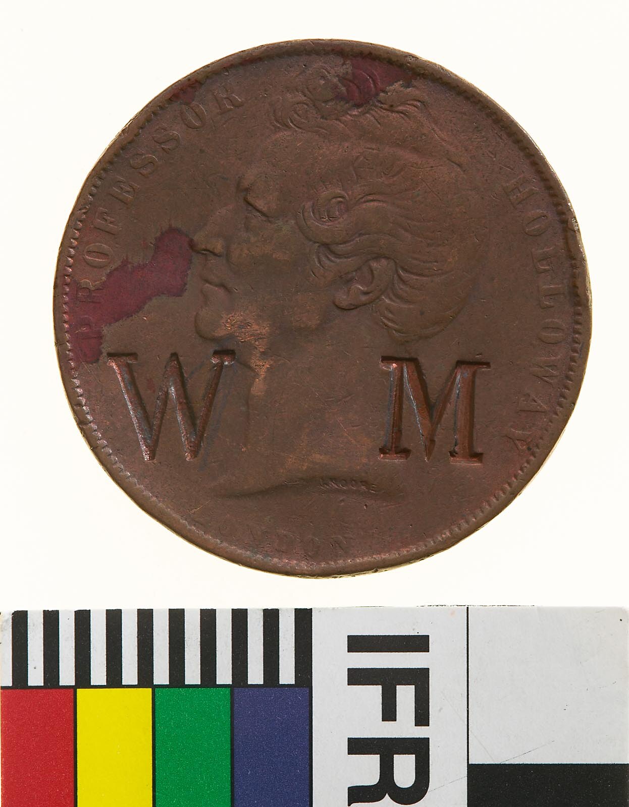 Head of Professor Holloway facing left with J. MOORE (the maker's name) incuse on neck truncation; around, PROFESSOR HOLLOWAY; below, LONDON, surcharged W M