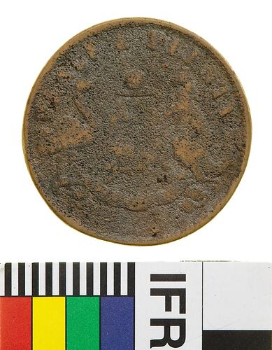 A crude cast of a round token (33 mm diameter) in brass, without the name of an issuer or mint. The obverse (so called as the seated Justice type is normally a reverse) features a coat of arms consisting of a central shield below a rising sun with emu and kangaroo supporters. The shield is quartered and contains: top left, Golden Fleece, top right, three masted sailing ship, bottom left bull standing facing left, bottom right, anchor. The supporters stand on a pair of simple curved lines which also hold the base of the shield, a ribbon bearing the motto ADVANCE AUSTRALIA is draped across these lines below their feet. Around above, PEACE & PLENTY. The reverse features a female figure representing Justice seated on a wool bale with legs to left but her head and upper body to front. A wine barrel lies on the ground behind her and a three-masted sailing ship sails to the right on the horizon to the left. She wears a blindfold and extends a balanced set of scales with her right hand. With her left she holds an inverted cornucopia from which fruits flow onto the ground. She wears an ancient-style of flowing dress bound at the waist, her left arm bare and right draped to near the elbow. Around above, MELBOURNE VICTORIA, in exergue, 1858.