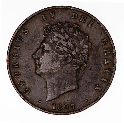 Laureate head of the King facing left; around above, GEORGIUS IV DEI GRATIA; below, 1827