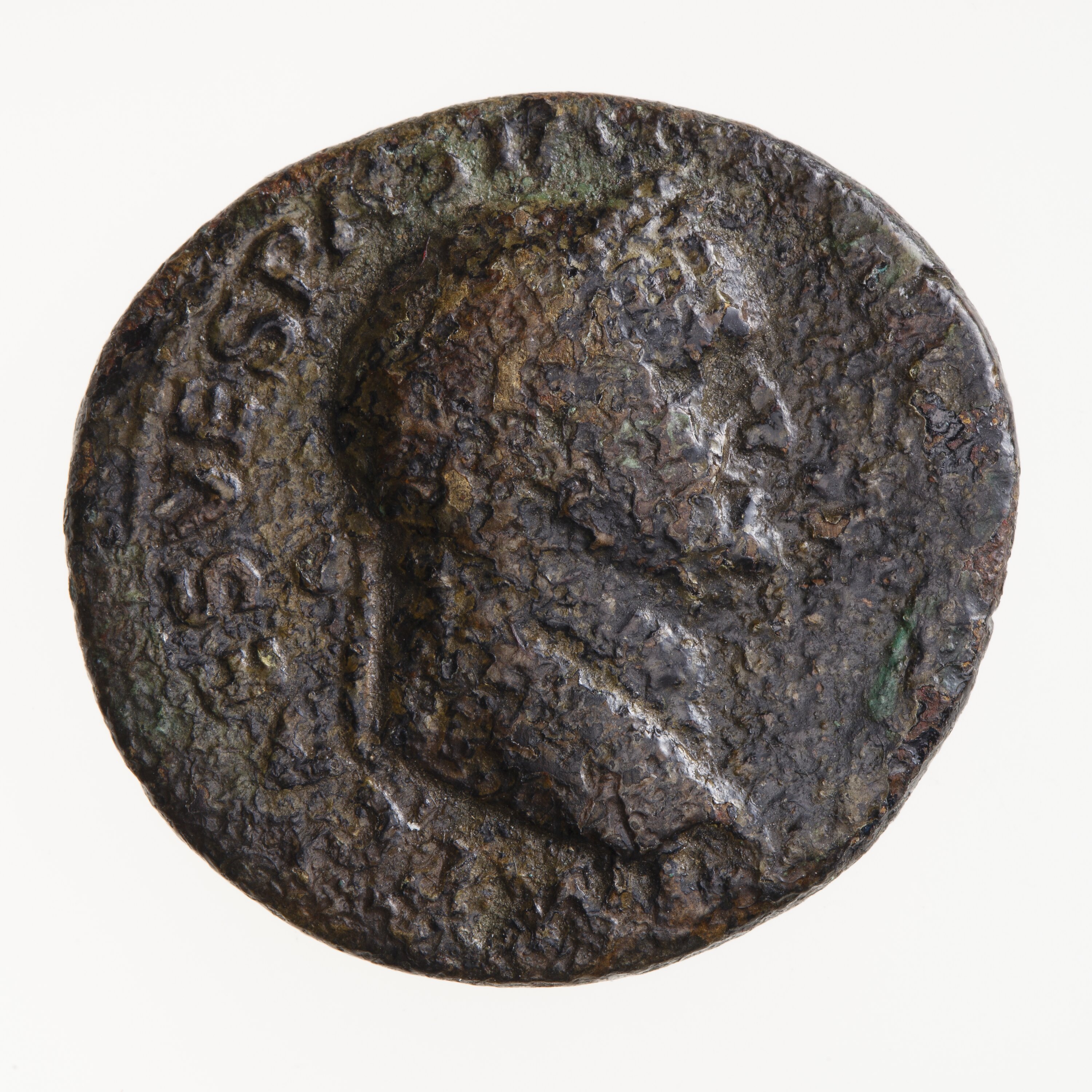 Copper As struck during the reign of the Emperor Vespasian in 71 AD, Ancient Roman Empire. Minted by Lugdunum. This particular form for Fortuna seems to only occur under Vespasian for the As denomination at Lugdunum during his third Consulship in 71 AD.