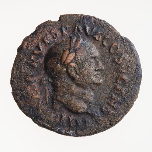 Copper As struck during the reign of the Emperor Vespasian in 74 AD, Ancient Roman Empire. Minted by Rome. The date of production is fixed by the appearance of COS V in the obverse legend. Vespasian was Consul for the fifth time in 74 AD and for the sixth time in 75 AD. Reference to the Censorship may suggest that this coin was struck well before the end of the year, he assumed that position on 1 July 73 AD and CENS on coins was discontinued while the Aequitas As pieces were being struck. It does not occur at all with COS VI.