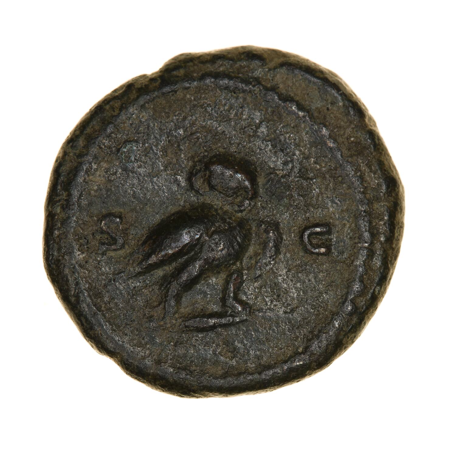 Anonymous Quadrans struck between the reign of the Emperors Domitian and Antoninus Pius in the period 81-161 AD. This piece listed under Domitian by von Guerard pre 1880. Minted by Rome, Ancient Roman Empire. RIC lists eleven different groups of Anonymous quadrantes (or tessarae) bearing the letters SC. This piece belongs to its Group II - Minerva.