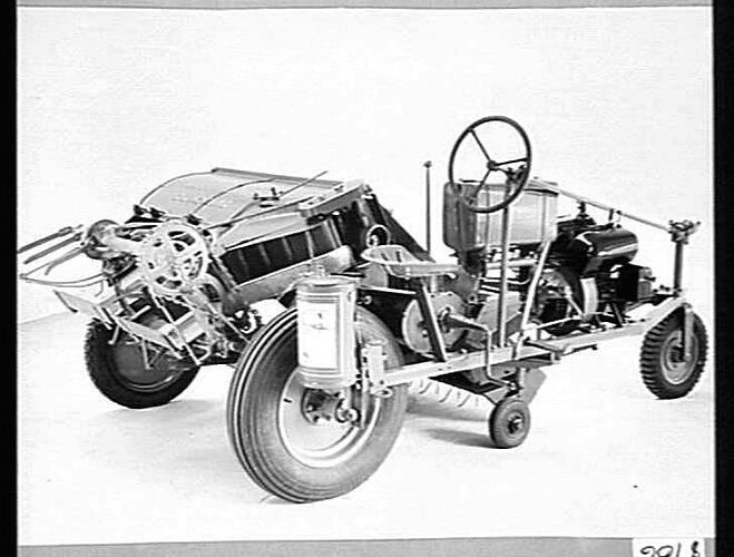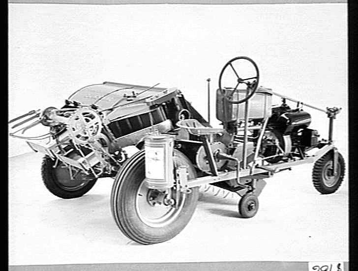The H.V. McKay Massey-Harris auto pick-up binder used for harvesting flax. (Flax is the straw which is left after the linseed is harvested.).