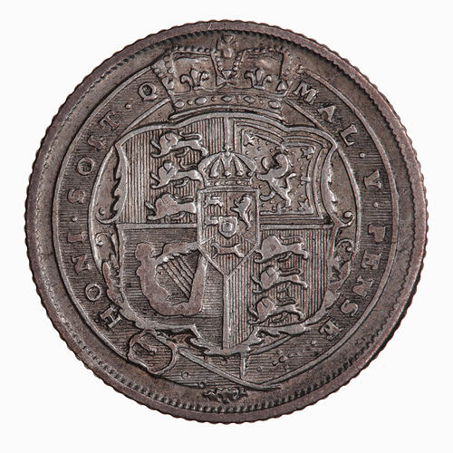 Crowned and garnished shield bearing royal Arms within the Garter with motto HONI SOIT Q MAL Y PENSE;