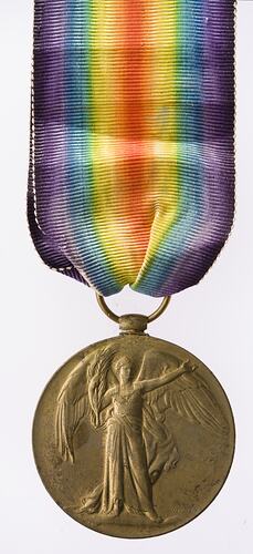 The Victory Medal was authorised in 1919 and was awarded to army, navy and air force personnel who served in a theatre of war between midnight 4th-5th August 1914 and midnight 11th-12th November 1918. The Allies resolved that, if they wished to issue a Victory Medal, it would share a common feature of a depiction of Victory on the obverse and a ribbon of red, yellow, green, blue and violet merged into a rainbow pattern. This medal, that of Great Britain, was awarded to personnel from countries in the British Empire (some 5,725,000 were issued). The other Allied countries that issued Victory medals were: Belgium, Brazil, Cuba, Czechoslovakia, France, Greece, Italy, Japan, Portugal, Romania, Thailand, Union of South Africa and the United States of America.