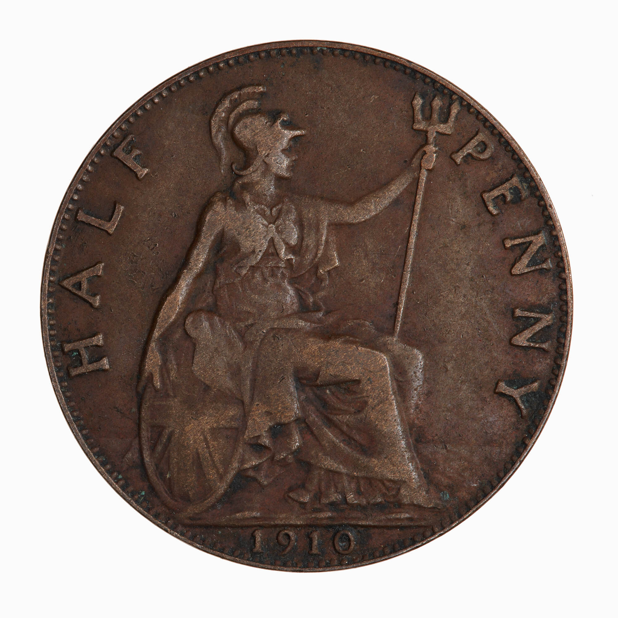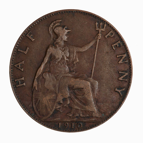 Britannia seated facing right on a rock wearing a helmet and flowing robes; she holds a trident and rests her right hand on a shield which bears the combined crosses of the Union Flag; around, ONE PENNY; in exergue, 1910