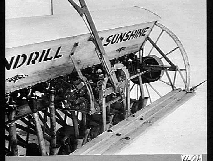 Rear view showing the drive-gear mechanism and disc lifting lever mechanism on a horse-drawn 12 disc light drill (English type).