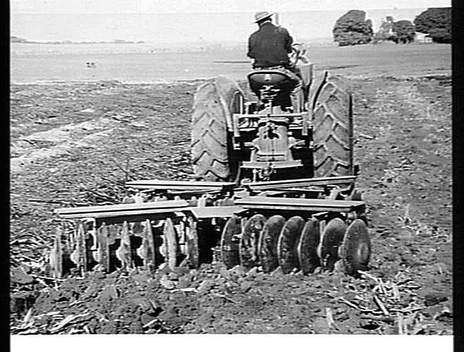 Massey Harris 744 diesel tractor pulling a 'Suntrac' disc harrow working on the MacLean Bros property at Ayr, Queensland.