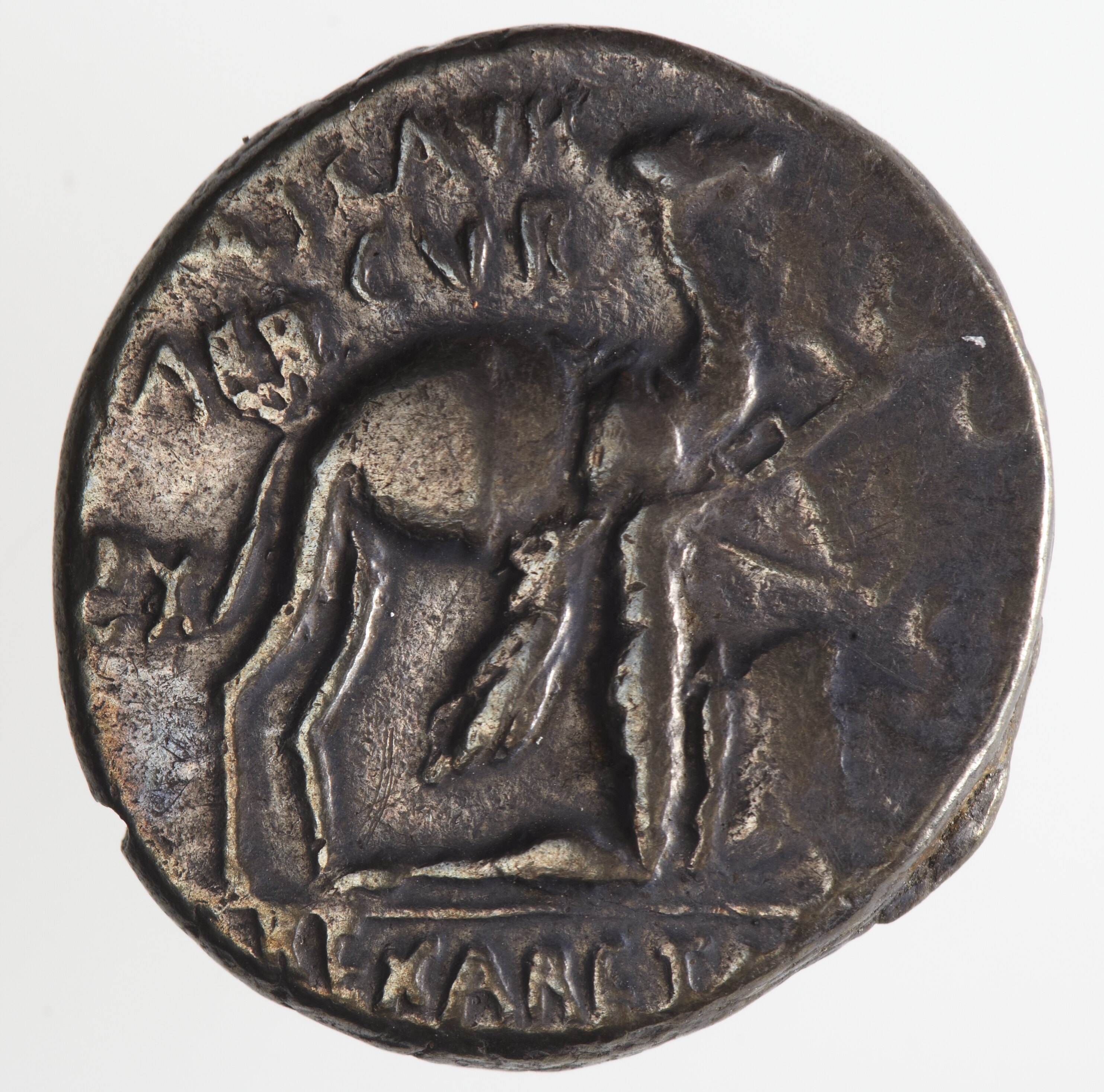 Marcus Aemelianus Scaurus as quaestor under Pompey intervened in Judaea and Nabataea in about 65 BC. He made great personal profit and accepted the surrender of King Aretas of Nabataea. In 58 BC he issued this coin commemorating "his inglorious campaign' (Oxford Classical Dictionary, p.958).
