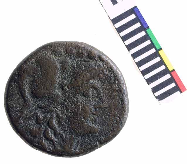 Part of a series of bronze coins from Teate with marks of value. The five beads on either side give the coins value as 5 uncia, a quincunx. The weights seem to correspond with those of the Roman copper coins introduced in about 211 BC with the as of about 36 g. (this coin is worn but gives an as of about 30g)