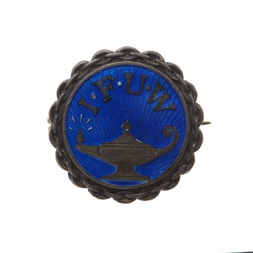 The Australian Federation of Graduate Women's website has a logo based on this badge's design. The website describes the original badge :" the logo [was] designed by members of the Norwegian Federation for the Third IFUW Conference in Oslo in 1924 and adopted by delegates as the permanent badge of IFUW and its national associations. The original showed an antique lamp representing the light of learning on a blue background broken with the letters IFUW. Around the central disc was an interlinked chain symbolizing the bonds of friendship linking IFUW members throughout the world. Eventually the lamp came to be known as the lamp of friendship. It was later modernized and the chain was dropped."