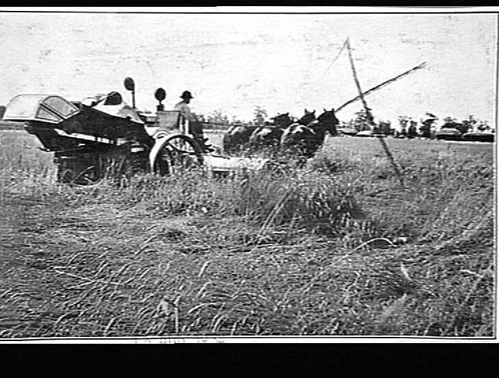 A horse-drawn H.S.T. E.F. Header working in a down and tangled crop.