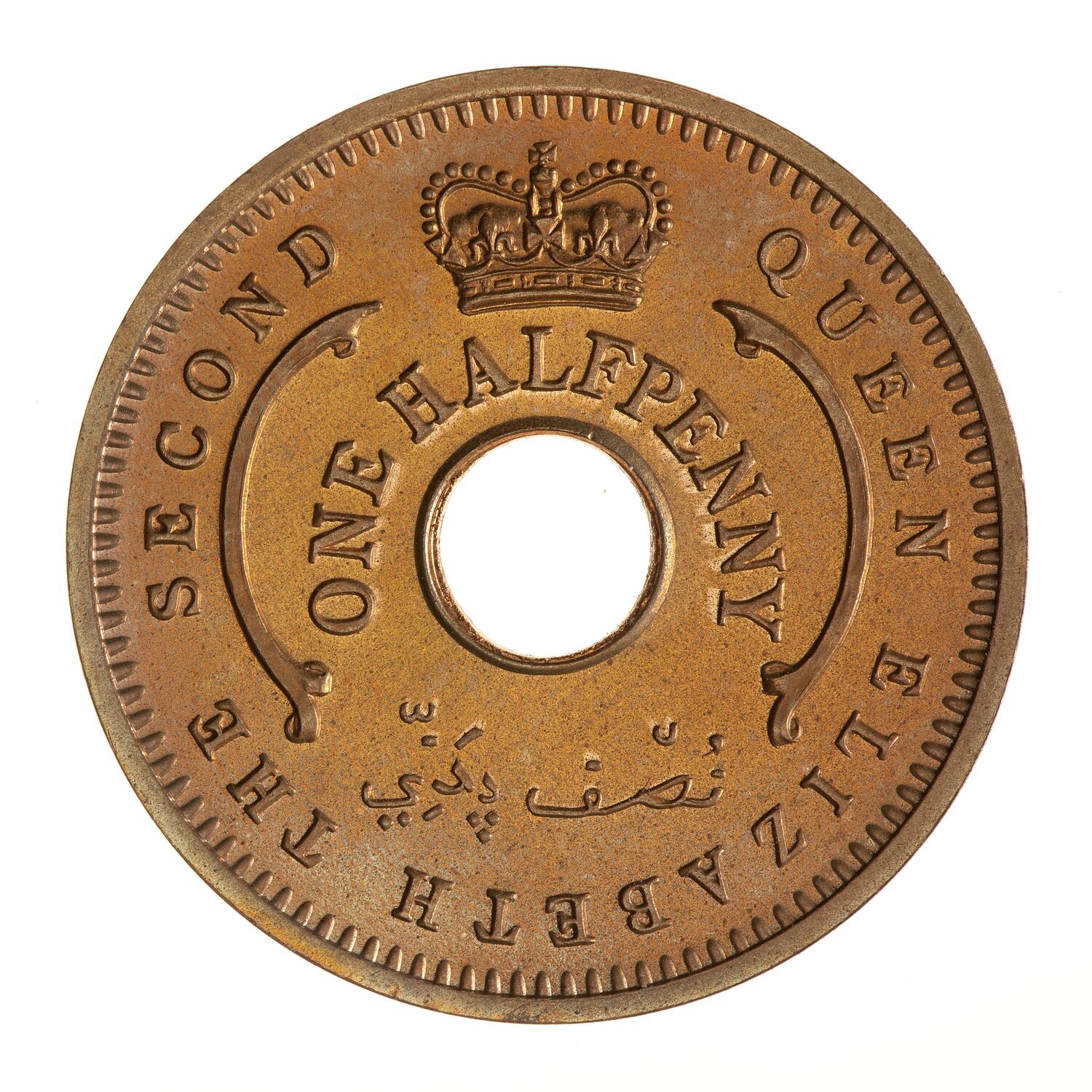 Around above central hole, ONE HALFPENNY; above denomination, a crown; below hole the denomination in Arabic script; around QUEEN ELIZABETH THE SECOND