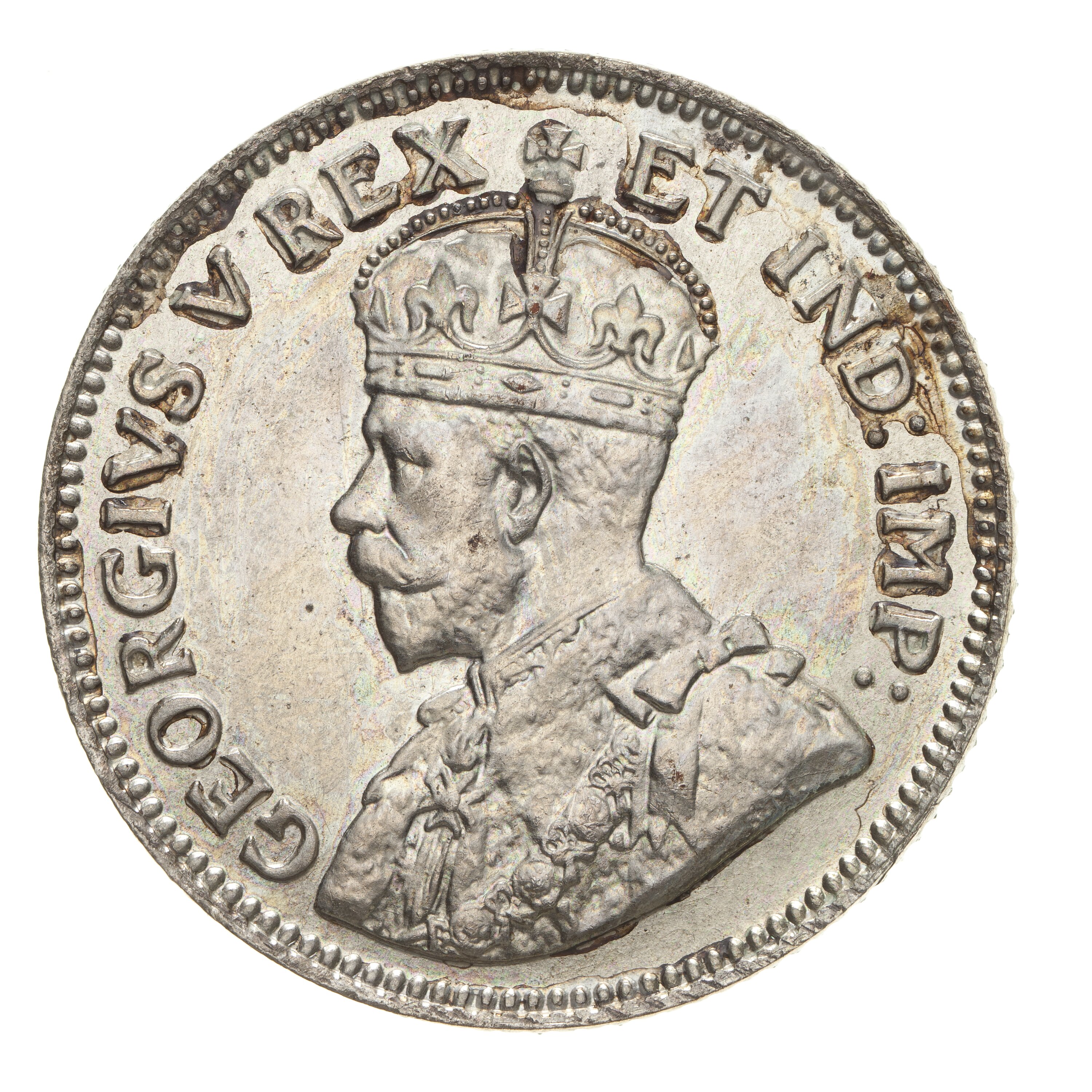 Crowned and draped bust of the King facing left, the King is wearing the Imperial Crown and the ermine Robe of State, the Collar of the Most Noble Order of the Garter, and the Badge of the Most Honourable Order of the Bath; around, GEORGIVS V REX ET IND: IMP:; artist's initial's, BM, on bust truncation