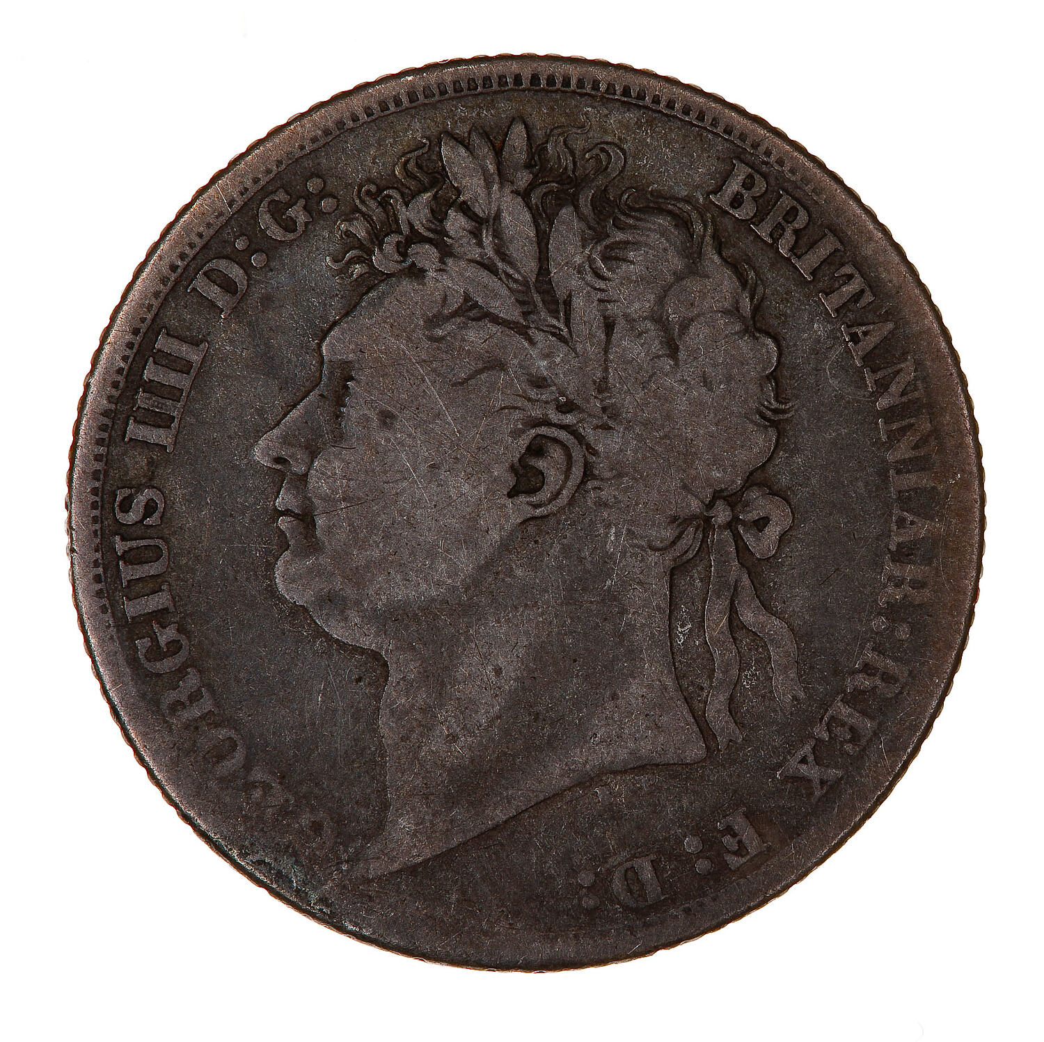 Crowned garnished shield bearing the royal arms surrounded by a rose, thistle and shamrock; in tiny letters at the centre of the shamrock leaves the artist's initials (worn), W.W.P. (William Wesley Pole); around below, ANNO 1821