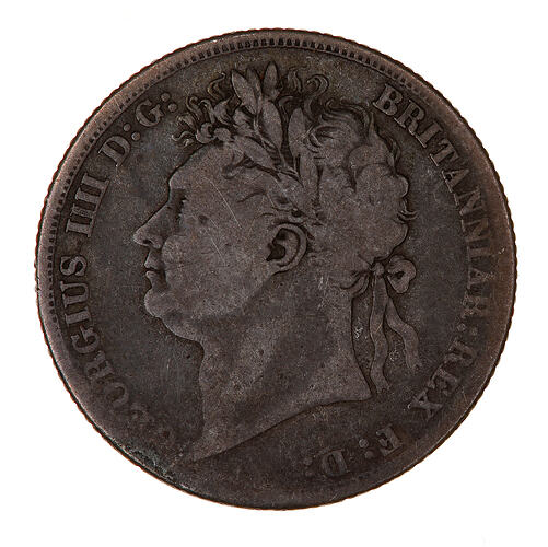 Laureate head of the King facing left; below, the artist's initials, B.P. (Benedetto Pistrucci); around, GEORGIUS IIII D: G: BRITANNIAR: REX F: D: