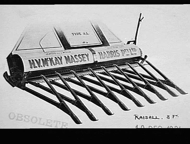 Signwriting on equipment depicted: 'TYPE AL' 'H.V. McKAY MASSEY HARRIS PTY. LTD.' Inscribed on image lower right: 'RAISALL. 8 FT.' Stamped on bottom of image: 'OBSOLETE' '19 DEC 1934'