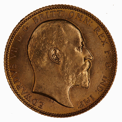 Bare head of the King facing right; below in small letters De S. (for G.W. De Saulles Mint Engraver); around, EDWARDVS VII DEI GRA: BRITT: OMN: REX FID: DEF: IND: IMP: