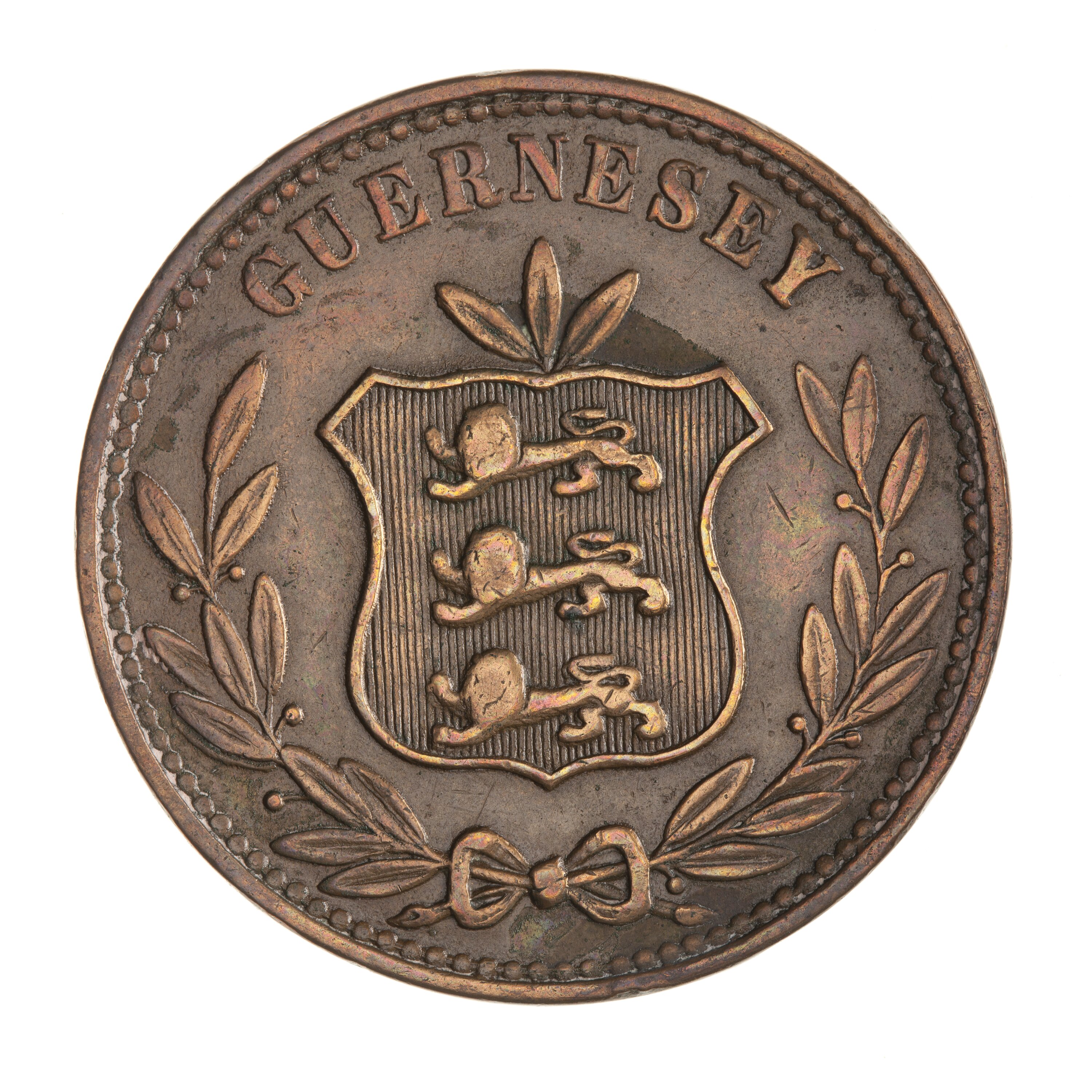 Shield of arms of Guernsey, three lions to left; around above, GUERNESEY; below, open laurel wreath