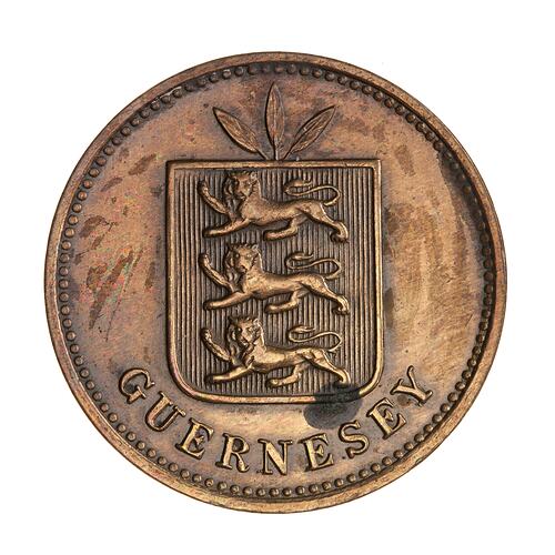 States of Guernsey shield of arms, 3 lions; around below, GUERNESEY