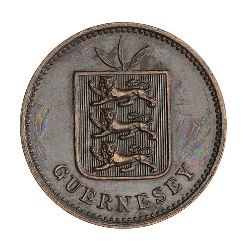 States of Guernsey shield of arms, 3 lions; around below, GUERNESEY