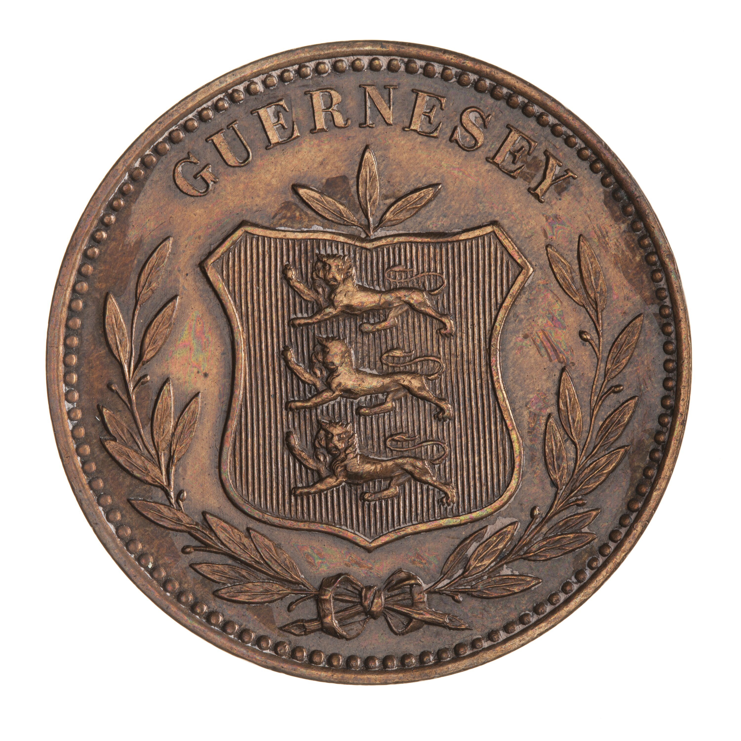 Shield of arms of Guernsey, three lions to left; around above, GUERNESEY; below, open laurel wreath