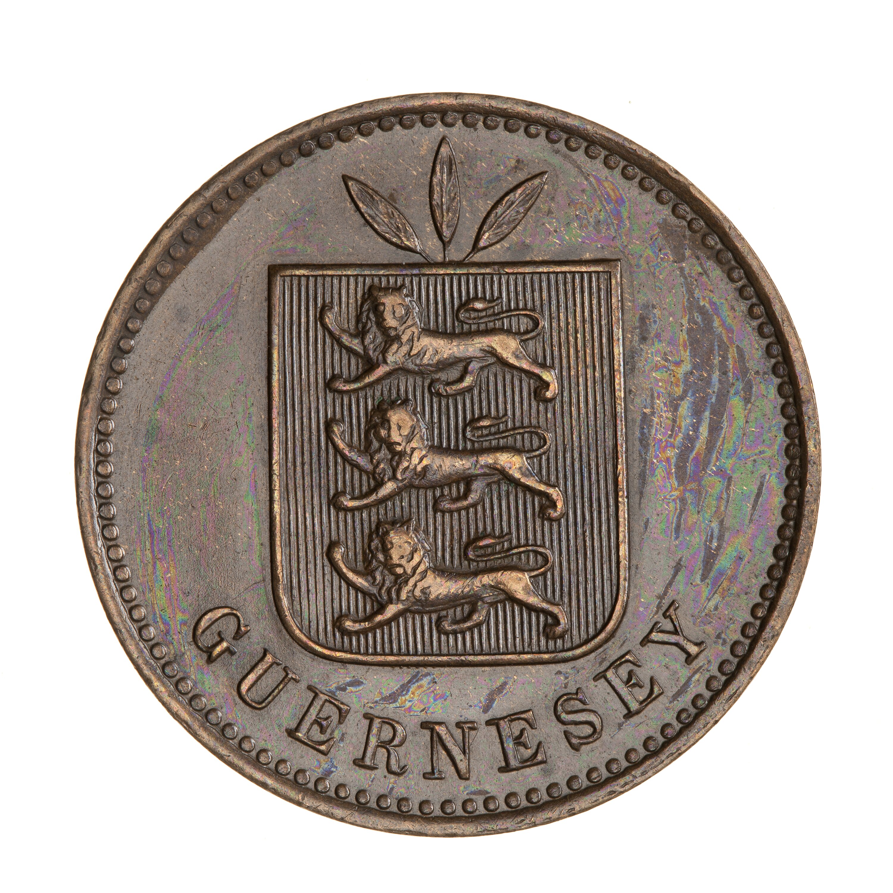 States of Guernsey shield of arms, 3 lions; around below, GUERNESEY