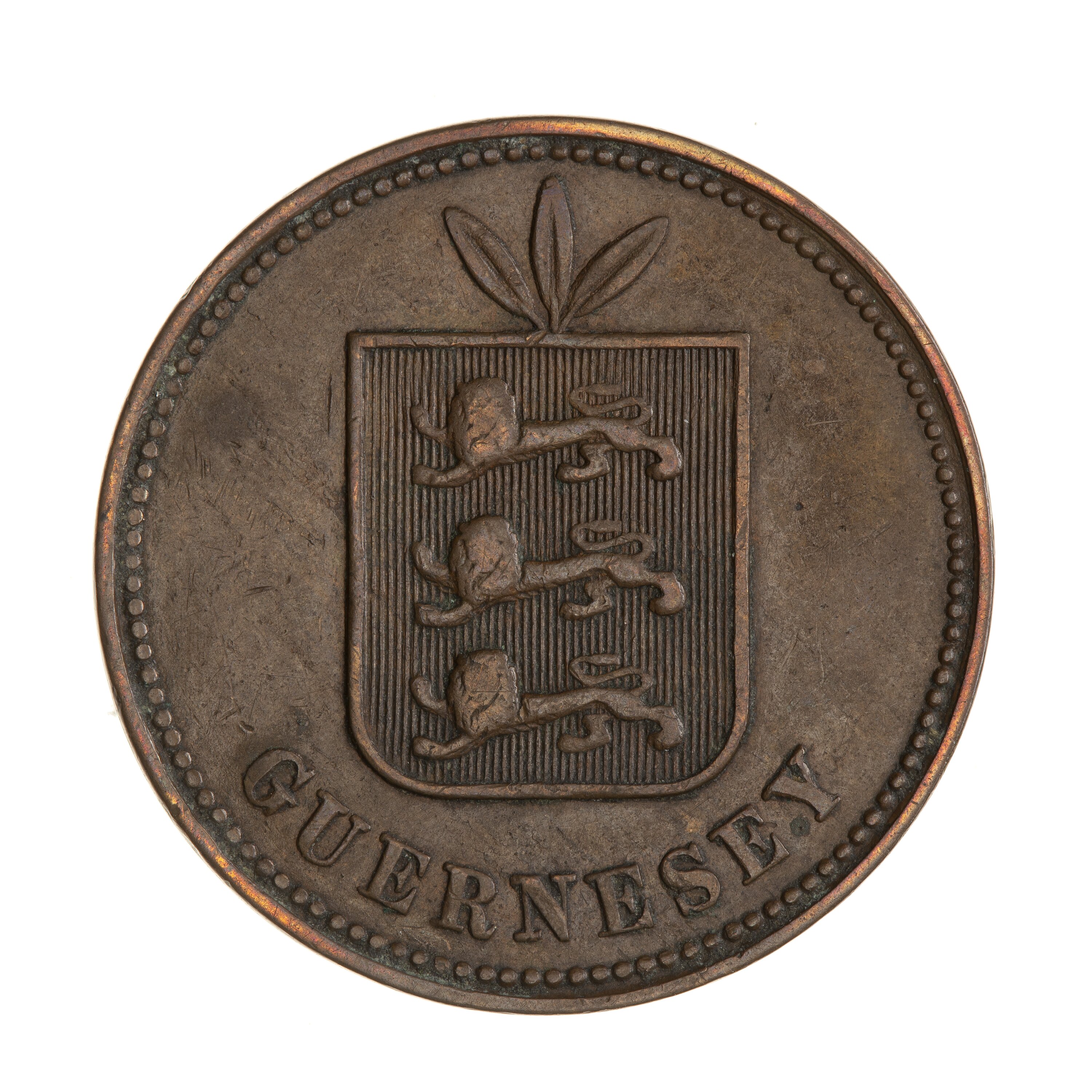 States of Guernsey shield of arms, 3 lions; around below, GUERNESEY