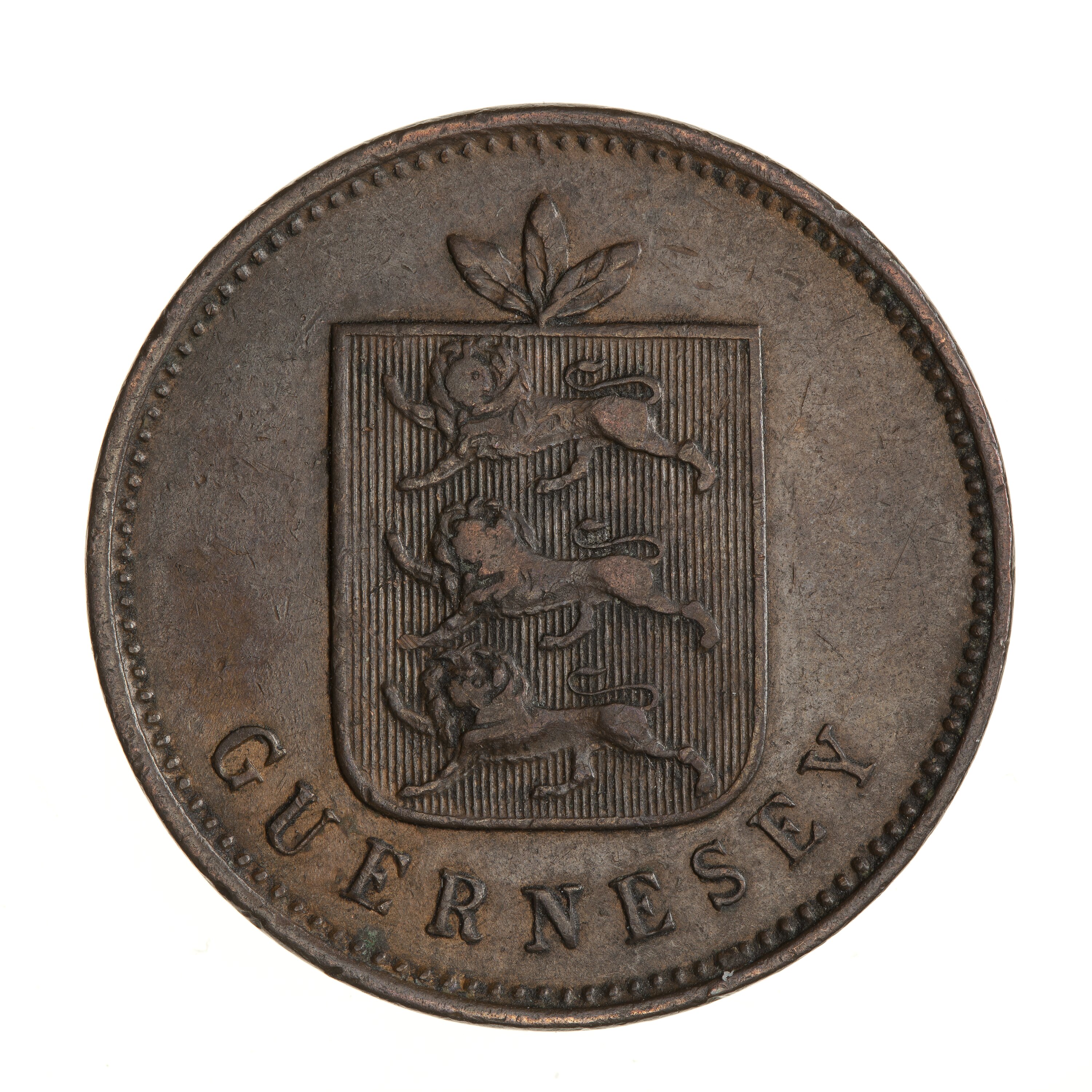 States of Guernsey shield of arms, 3 lions; around below, GUERNESEY