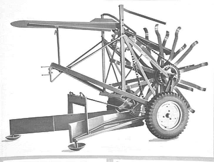 A Model 512 Sunlifter bale loader. This machine (which is towed from the right-hand rear corner of the transporting vehicle, using a special tow-bar) is used for picking up bales and loading them onto the transporting vehicle.