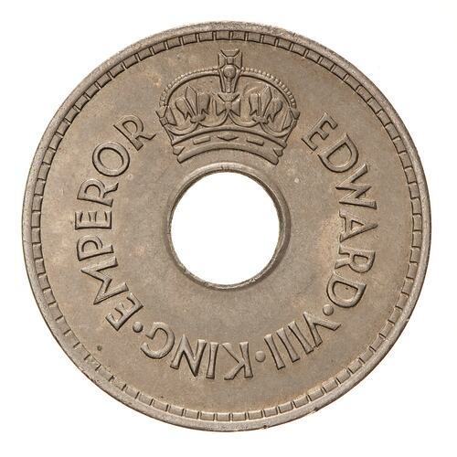 Above central hole, a crown; around hole, EDWARD VIII KING EMPEROR