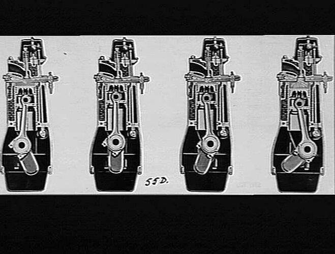 Sectional view of the crank and connecting rod, piston and valves on a Model 55 diesel engine.