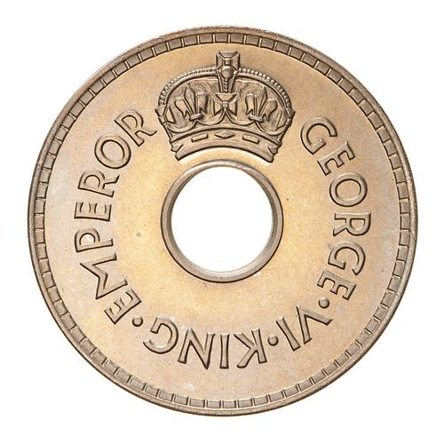 Above central hole, a crown; around hole, GEORGE VI KING EMPEROR