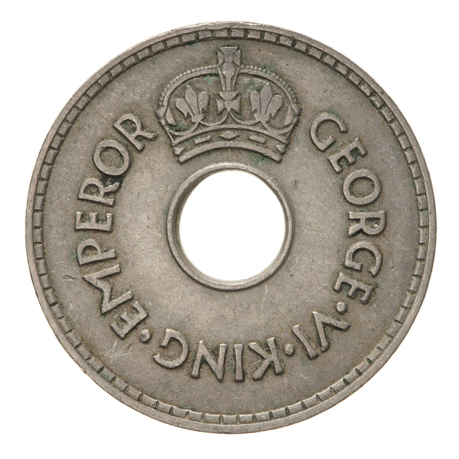 Above central hole, a crown; around hole, GEORGE VI KING EMPEROR