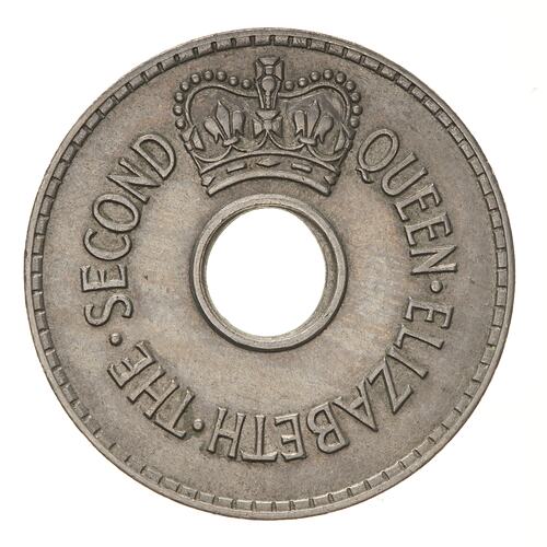 Above central hole, a crown; around hole, QUEEN ELIZABETH THE SECOND