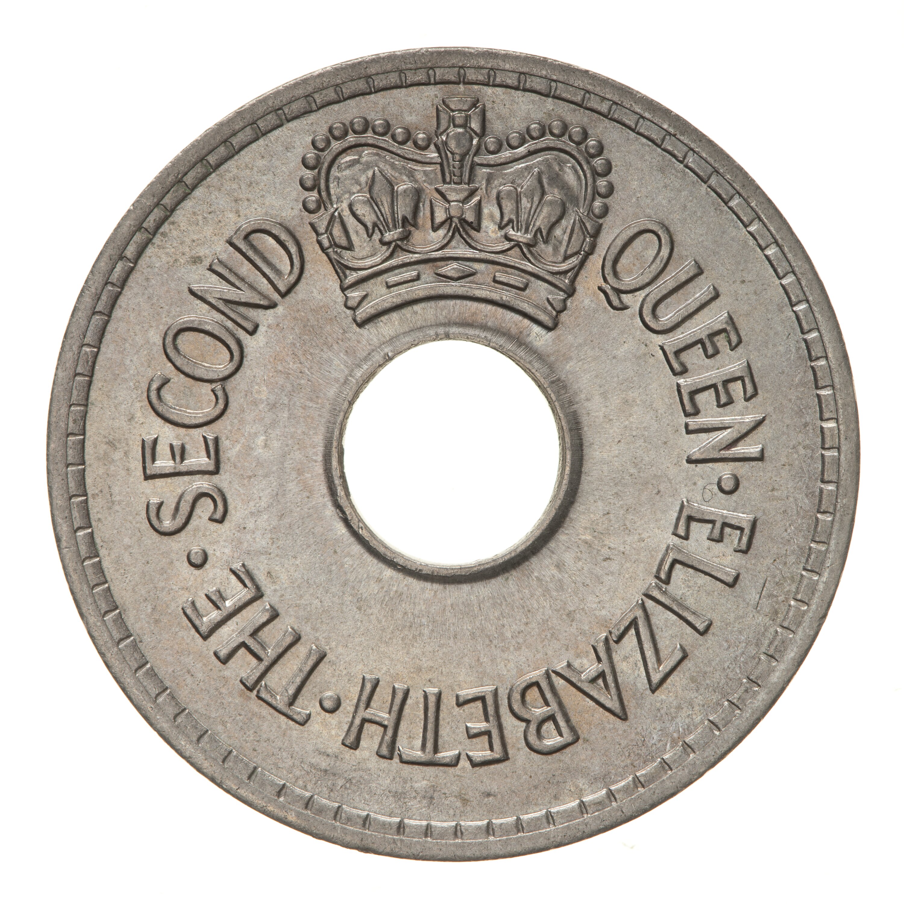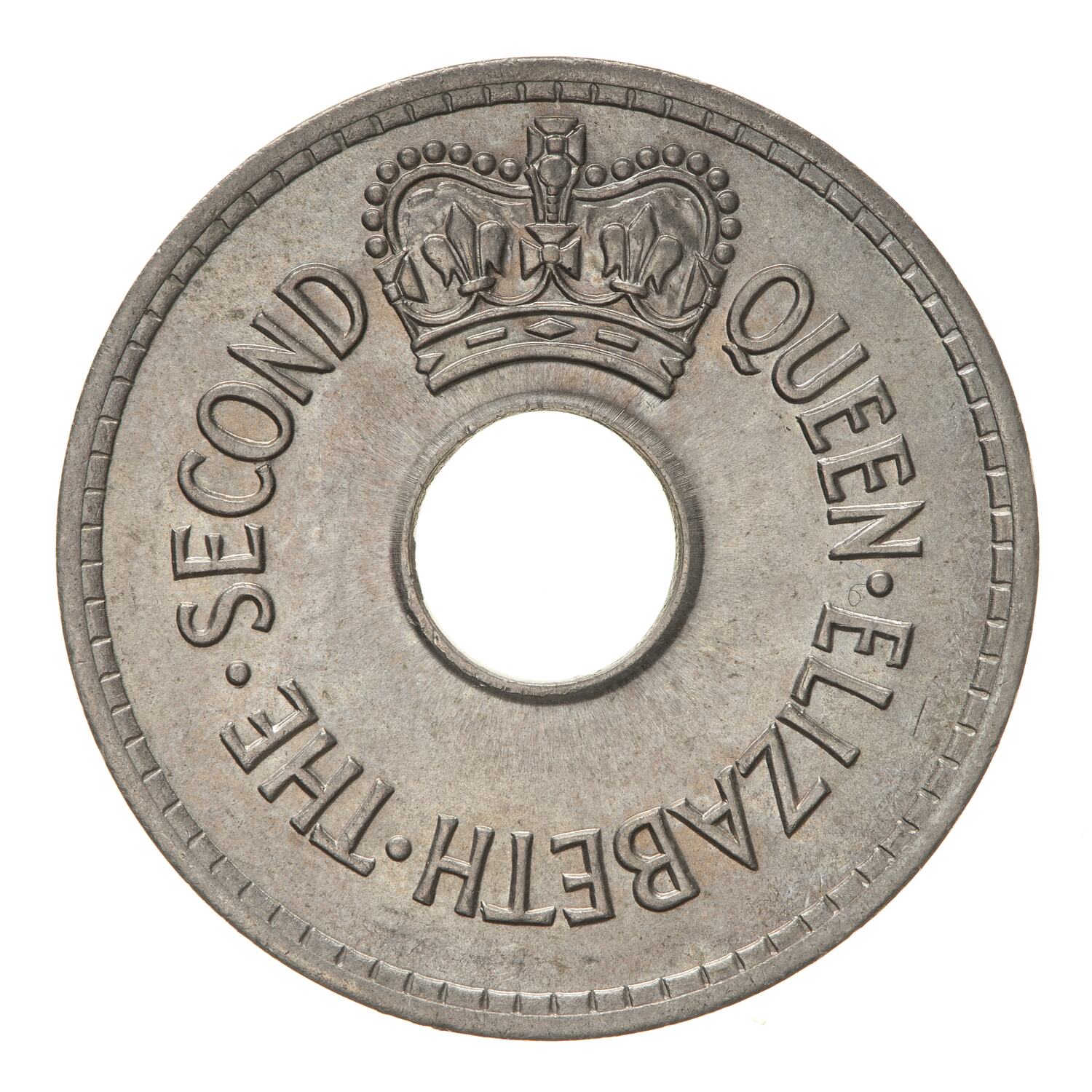 Above central hole, a crown; around hole, QUEEN ELIZABETH THE SECOND