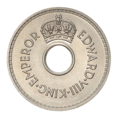 Above central hole, a crown; around hole, EDWARD VIII KING EMPEROR