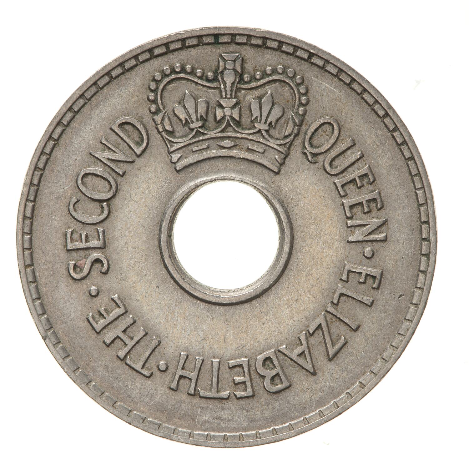 Above central hole, a crown; around hole, QUEEN ELIZABETH THE SECOND