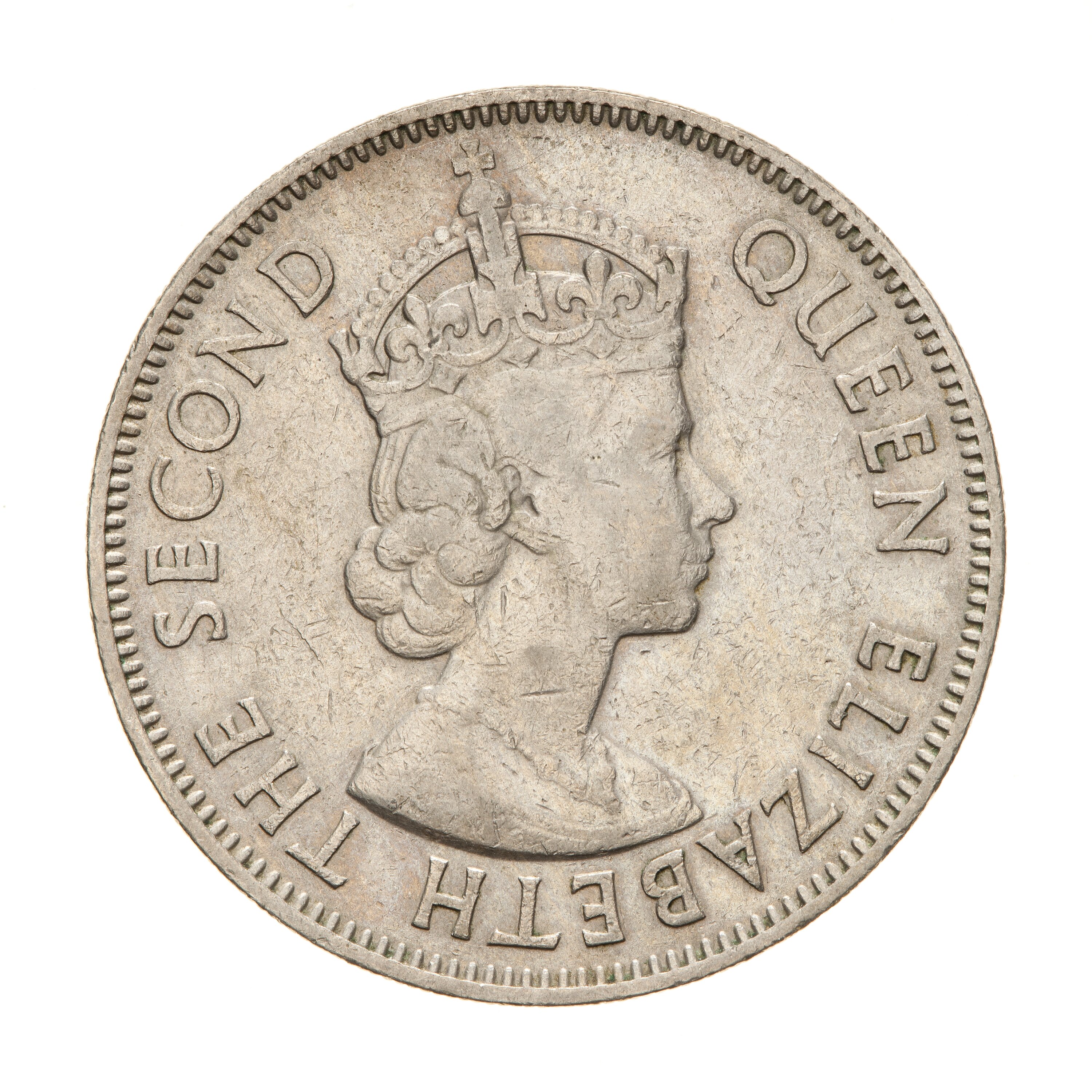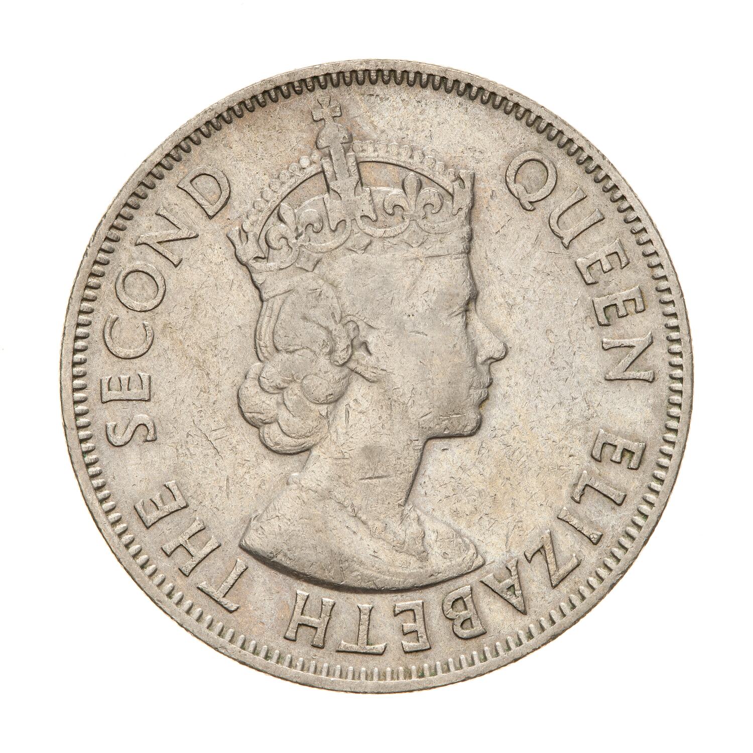 Crowned bust of the Queen facing right; around, QUEEN ELIZABETH THE SECOND