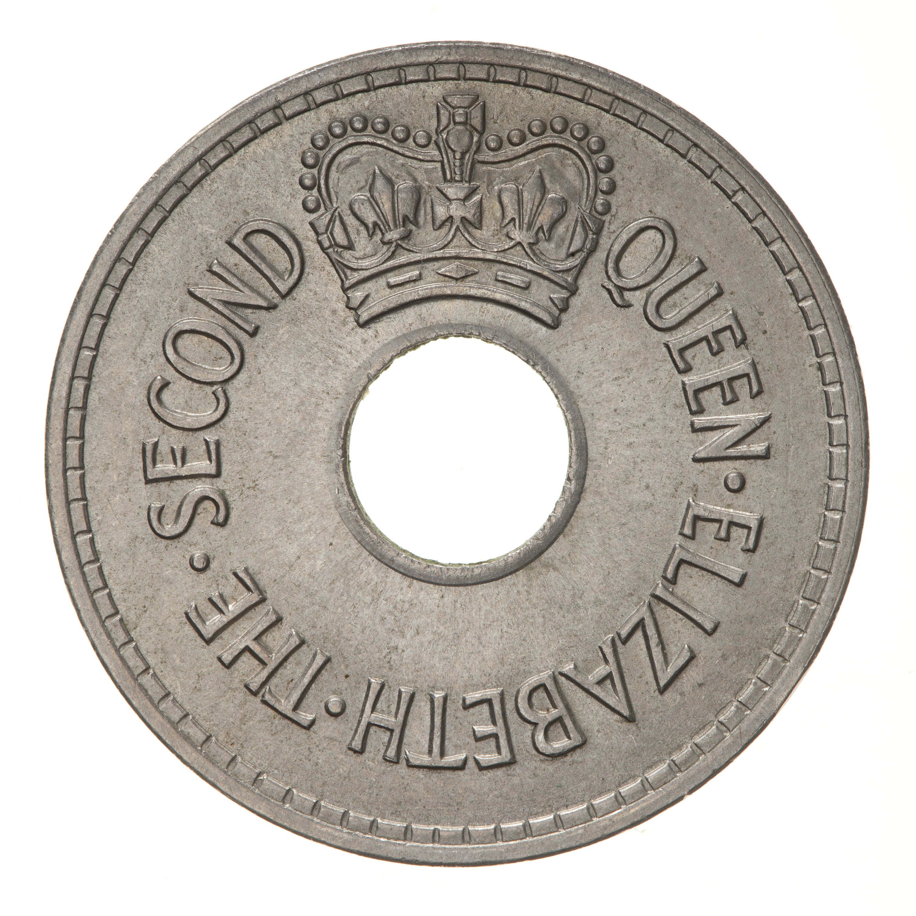 Above central hole, a crown; around hole, QUEEN ELIZABETH THE SECOND