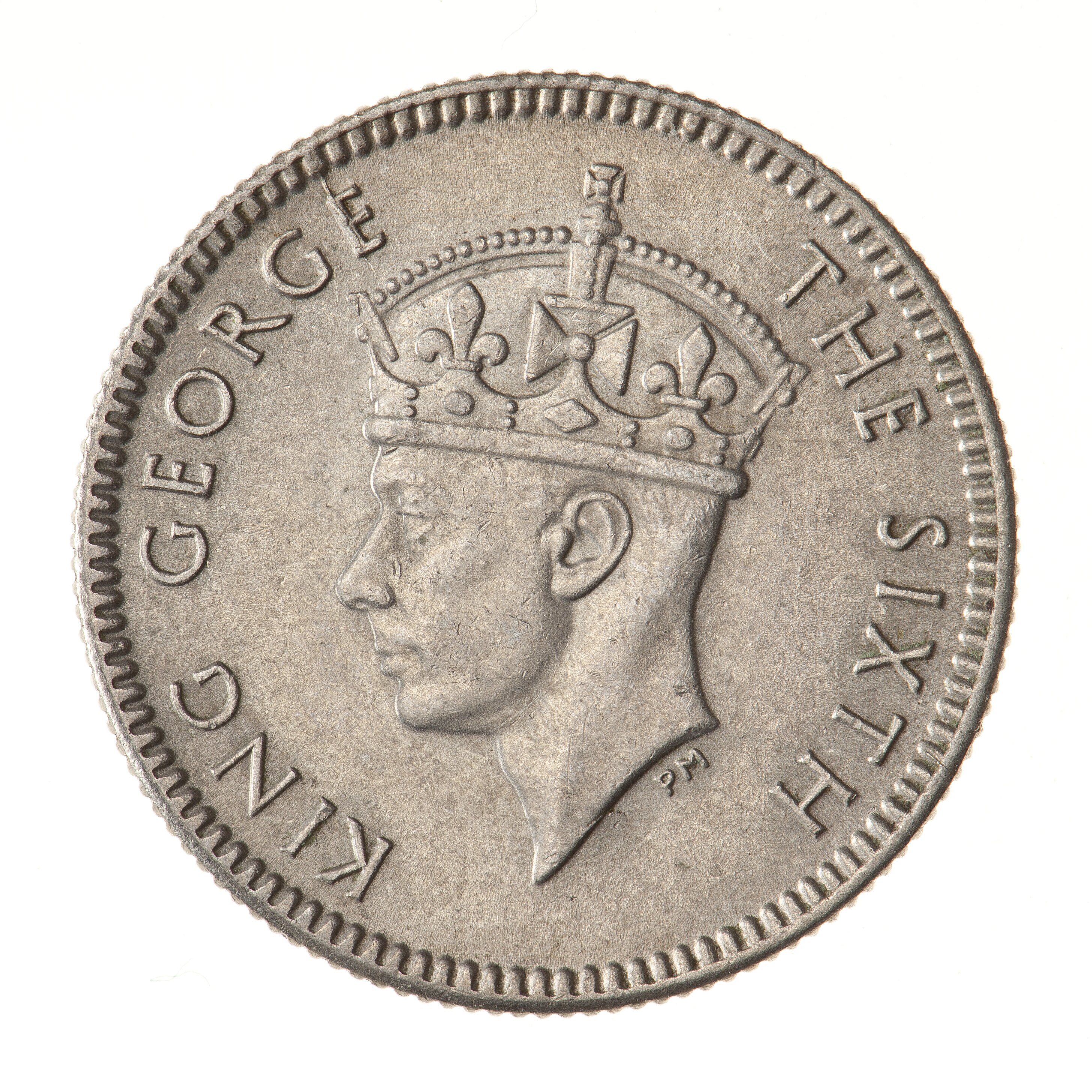 Crowned head of the King facing left; around, KING GEORGE THE SIXTH; artist's initials, PM, below neck