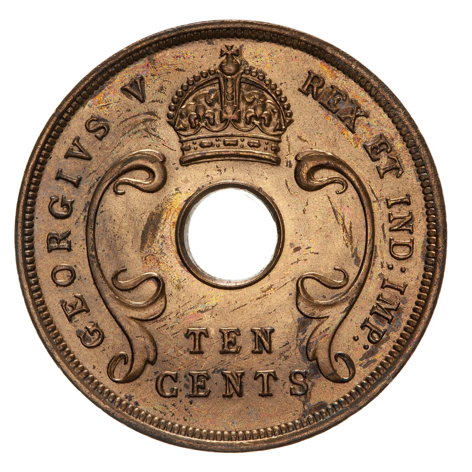 A central hole with curved floral design to left and right; above hole, crown; below hole in two lines, TEN / CENTS; around, GEORGIVS V REX ET IMP: IND: