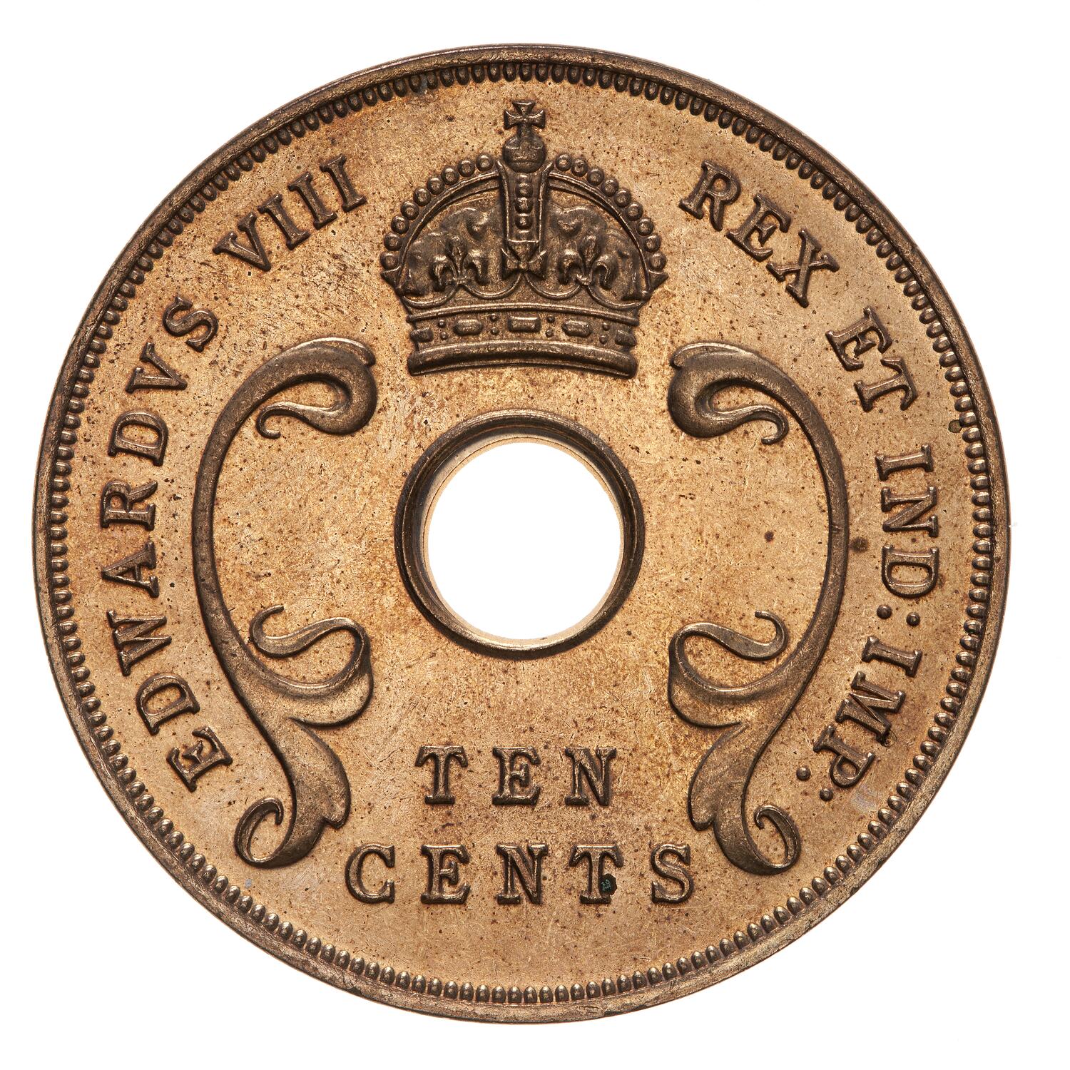 A central hole with curved floral design to left and right; above hole, crown; below hole in two lines, TEN / CENTS; around, EDWARDVS VIII REX ET IMP: IND: