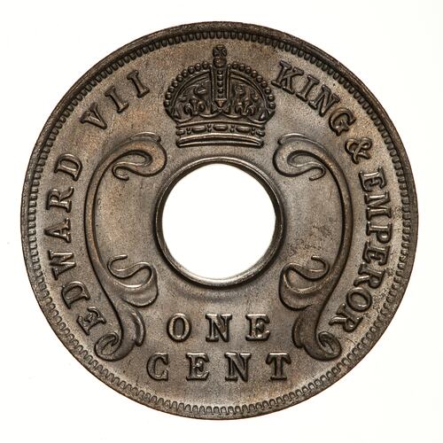 A central hole with curved floral design to left and right; above hole, crown; below hole in two lines, ONE / CENT; around, EDWARD VII KING & EMPEROR