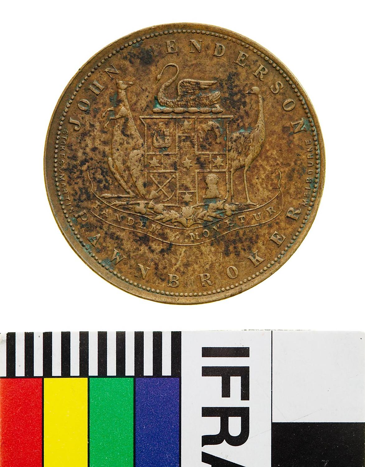 At centre a coat of arms with a swan as crest and kangaroo and emu supporters. The shield is quartered by a cross with a star at the centre and at the end of each arm, top left, three-masted sailing ship, top right, golden fleece, lower left, crossed pick and spade, lower right, wheat-sheaf. The shiels is set above a bouquet of rose, thistle and shamrock set above a ribbon with the Latin motto TANDEM MOVETUR. Around above, JOHN HENDERSON; below, PAWNBROKER; in tiny letters on either side the makers name, STOKES & MARTIN MELBOURNE